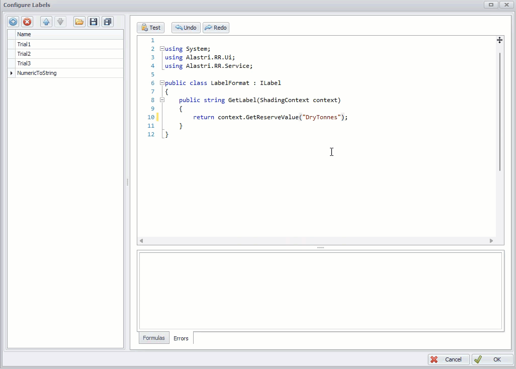 - Press the Test button to make sure your code is correct. Any errors found will be shown in the Errors panel and won’t let you to proceed.