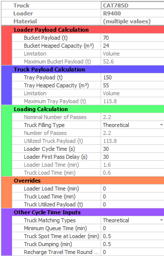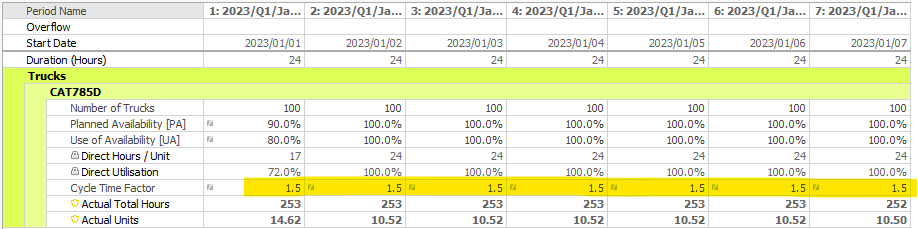 2. Apply a factor to the Cycle time, for this example we will apply 1.5. We expect to see an increase in cycle time as well as an increase to the the total number of trucks required and subsequently an increase in total truck hours.