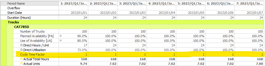 Utilise this row to begin altering the cycle time factor by the factor entered. The default factor applied is 1 therefore the factor will not have an affect on the trucking results.