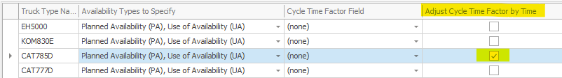 2. Select the truck you wish to Factor and tick the box in the "Adjust Cycle Time Factor by Time" column.