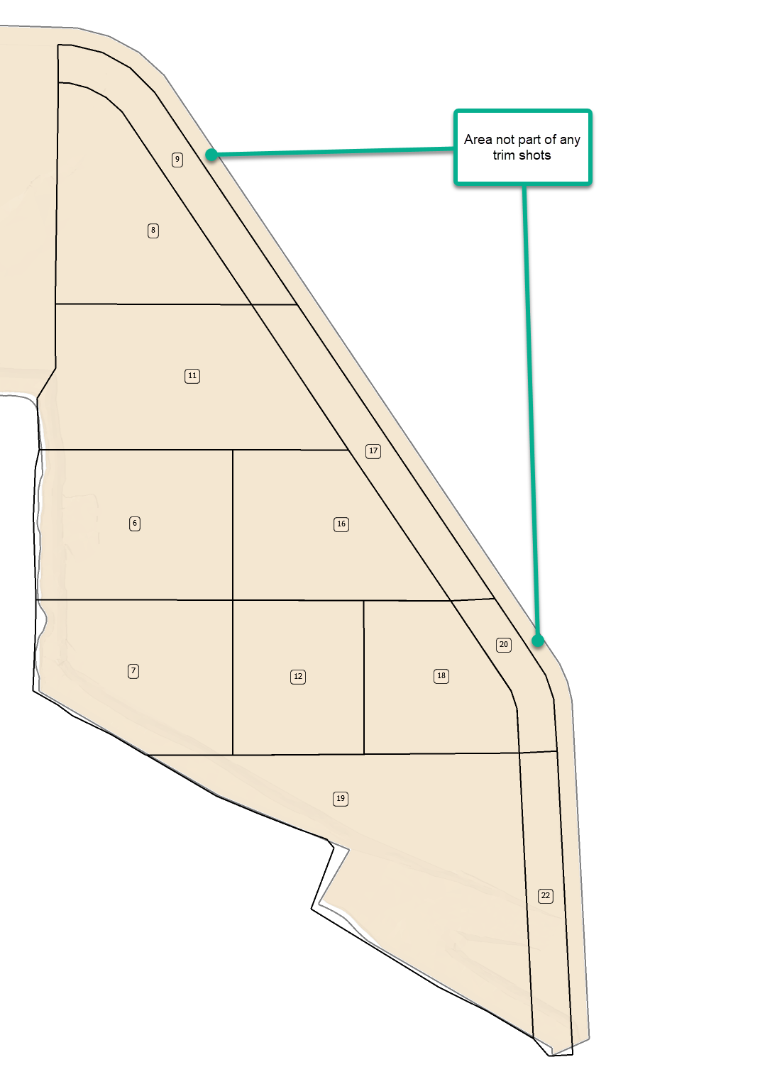 In this example the bench plan has been designed to the toe of the bench leaving leaving the area closest to the final wall not assigned to any trim shots.