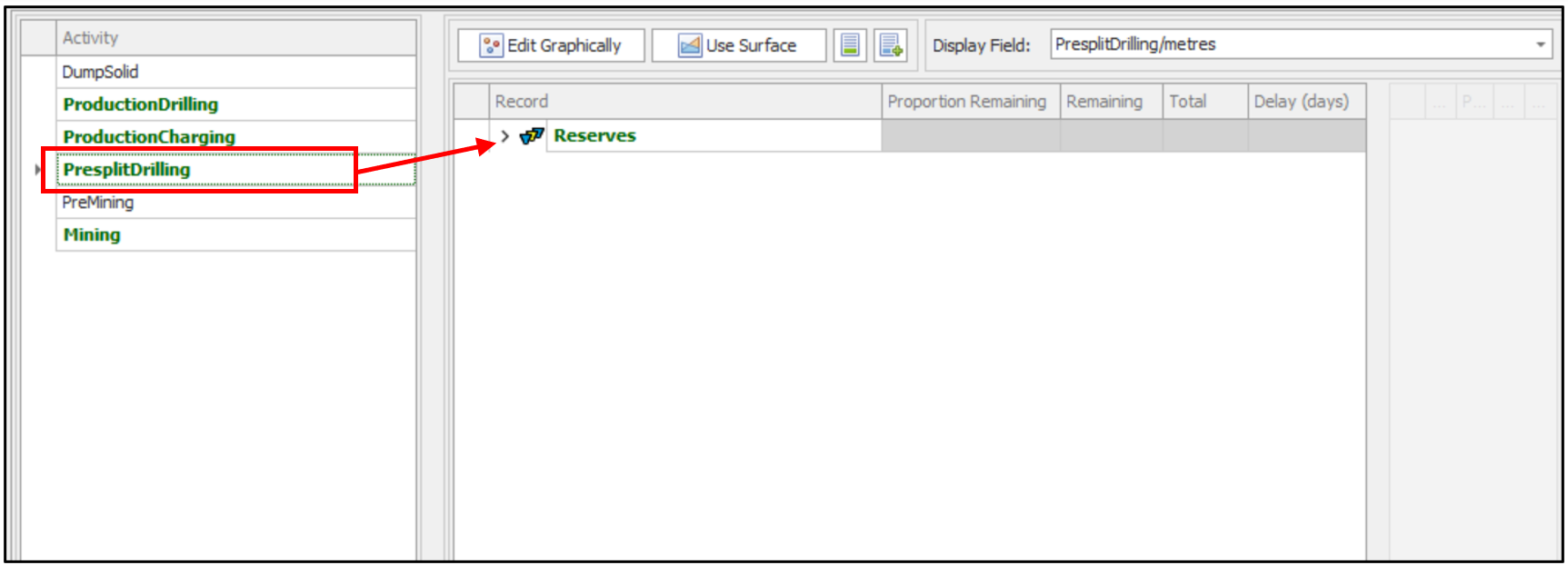 - In the Activity panel, select the activity to be prescheduled (Drilling, Charging, Blasting, Mining, or Dumping).