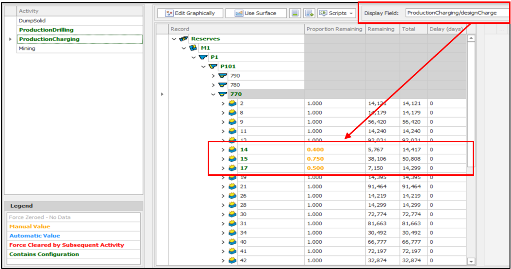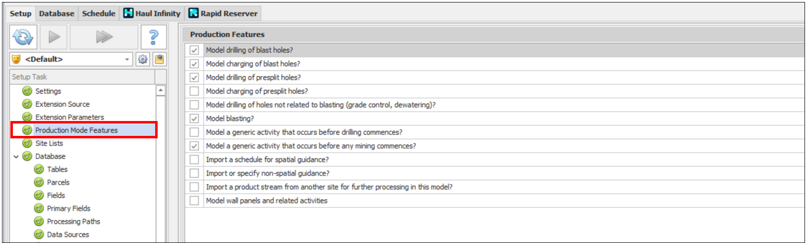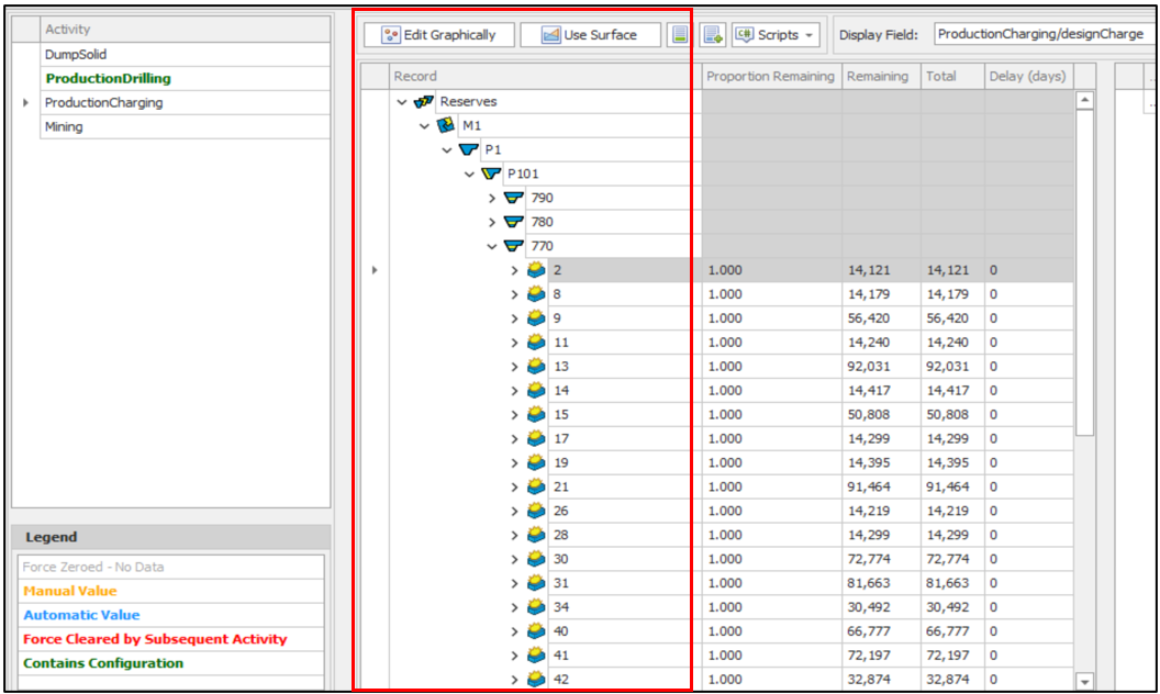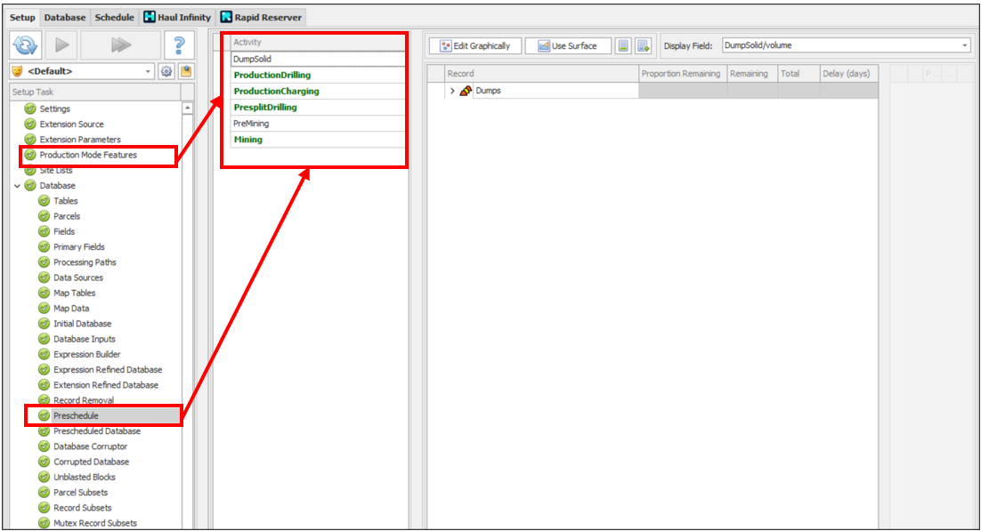 - The activity list in the Production Mode Features step must be adequately configured to include all relevant mining activities specific to the site (Drilling, Charging, Blasting, Mining, Dumping, Batter Pulling).