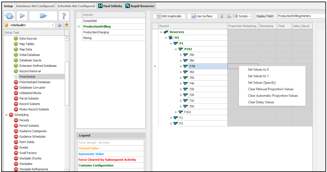 Users have the capability to update the status of each block within an activity, document the remaining proportion for partially completed tasks, perform bulk edits on groups of blocks and activities, and ensure that activity precedence is maintained. Common activities that can be prescheduled include drilling, charging, blasting, mining, and dumping. This process produces a clean, validated dataset where each block accurately represents the outstanding work required prior to the commencement of scheduling.