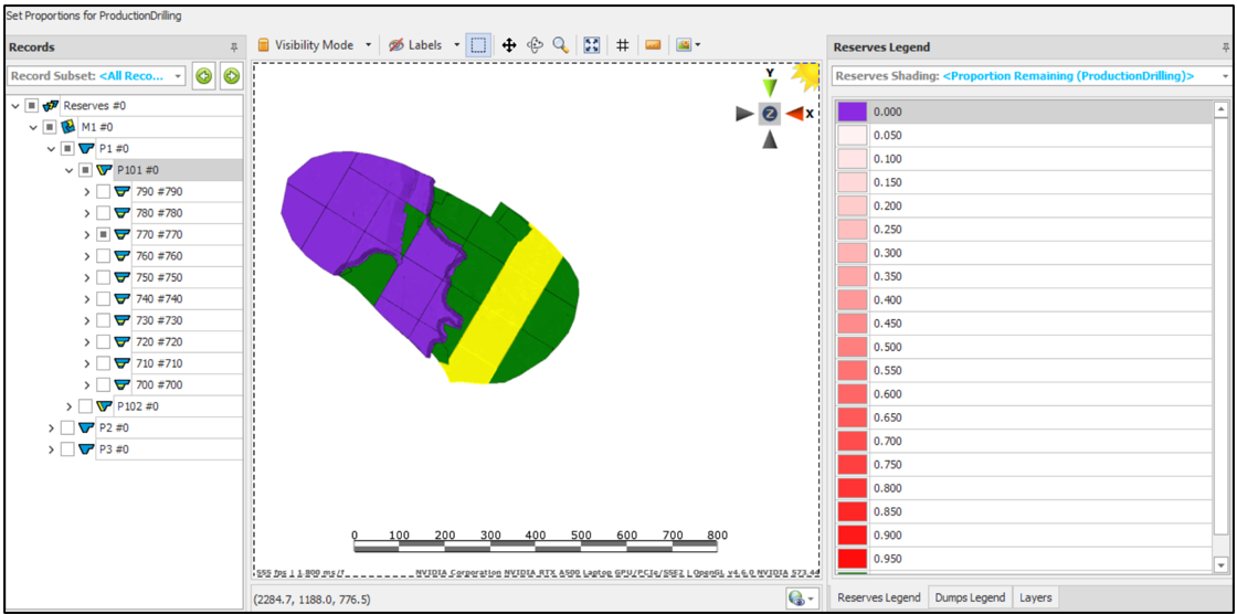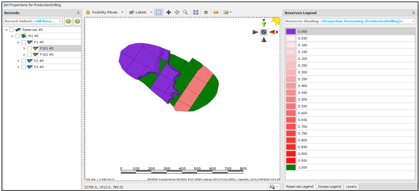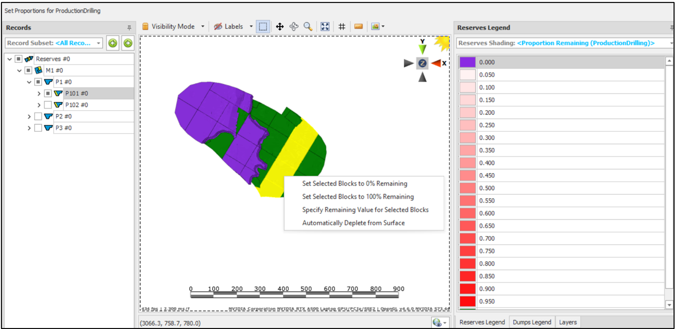 - This feature allows the user to preschedule blocks or benches while maintaining an overview of the entire pit. To select multiple blocks, first select one block, then hold the Control key and select additional blocks.