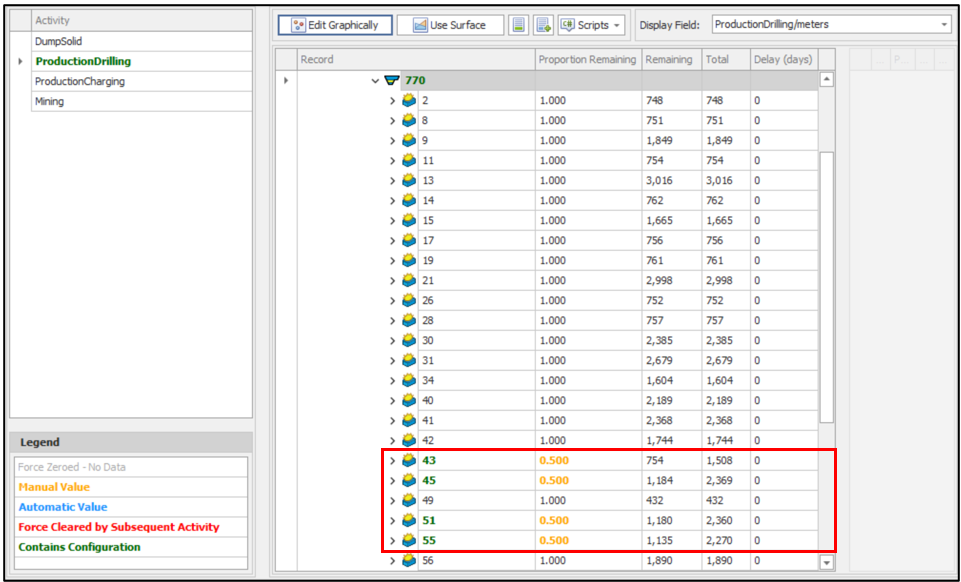 - Then modify the selection to update the Status to one of the following: 0% Remaining Proportion, 100% Remaining Proportion, Specify Remaining Proportion, or Automatically Deplete from Surface (for example, set Drilling to Half Complete with 50% Remaining for all selected items).
