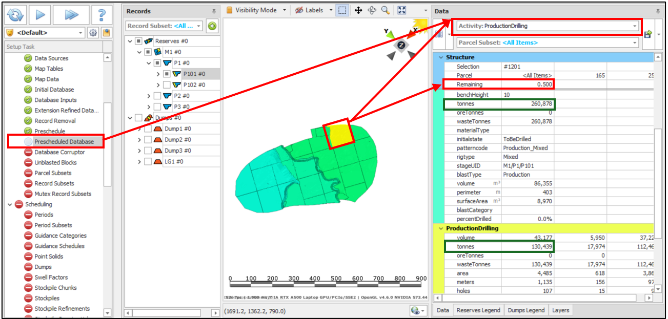 Upon completion of the prescheduling process, the user may proceed to the Prescheduled Database step. At this stage, the database is presented reflecting the modifications made during the Preschedule step. For instance, blocks prescheduled to 50% drilled will appear as half drilled within the Prescheduled Database. The block shown below has a total of 260,878 tonnes; however, due to the prescheduling, only 130,439 tonnes remain to be drilled.