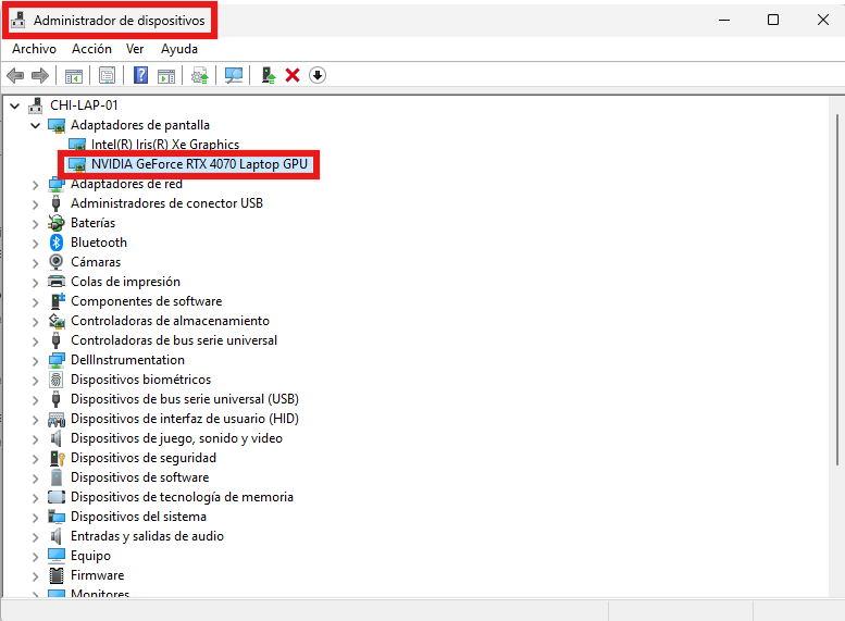 Expande la carpeta Adaptadores de pantalla para ver la GPU disponible. Si solo ves una tarjeta Intel® y ninguna otra, entonces no hay una GPU dedicada disponible, y el hardware no es compatible con el software de Alastri. Necesitarás hablar con tu empleador o el departamento de IT sobre nuevo hardware.